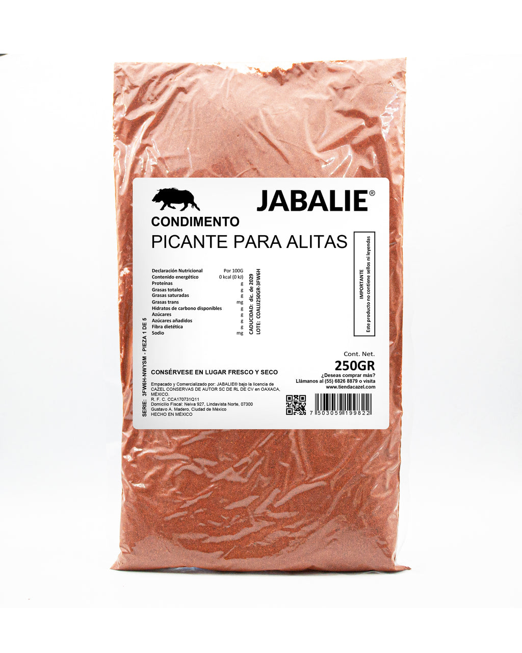 Condimento Picante Para Alitas JABALIE® 250 gr Mezcla de especias cuidadosamente seleccionadas diseñada para realzar el sabor de alitas de pollo y otras carnes. Esta fórmula experta combina chiles y condimentos naturales que penetran profundamente en la carne, creando un perfil de sabor picante y complejo. Con 250 gramos de contenido, rinde múltiples preparaciones. Ideal para asar, hornear o freír. Sin aditivos innecesarios, solo ingredientes auténticos que transforman cada bocado en una experiencia culinaria memorable.