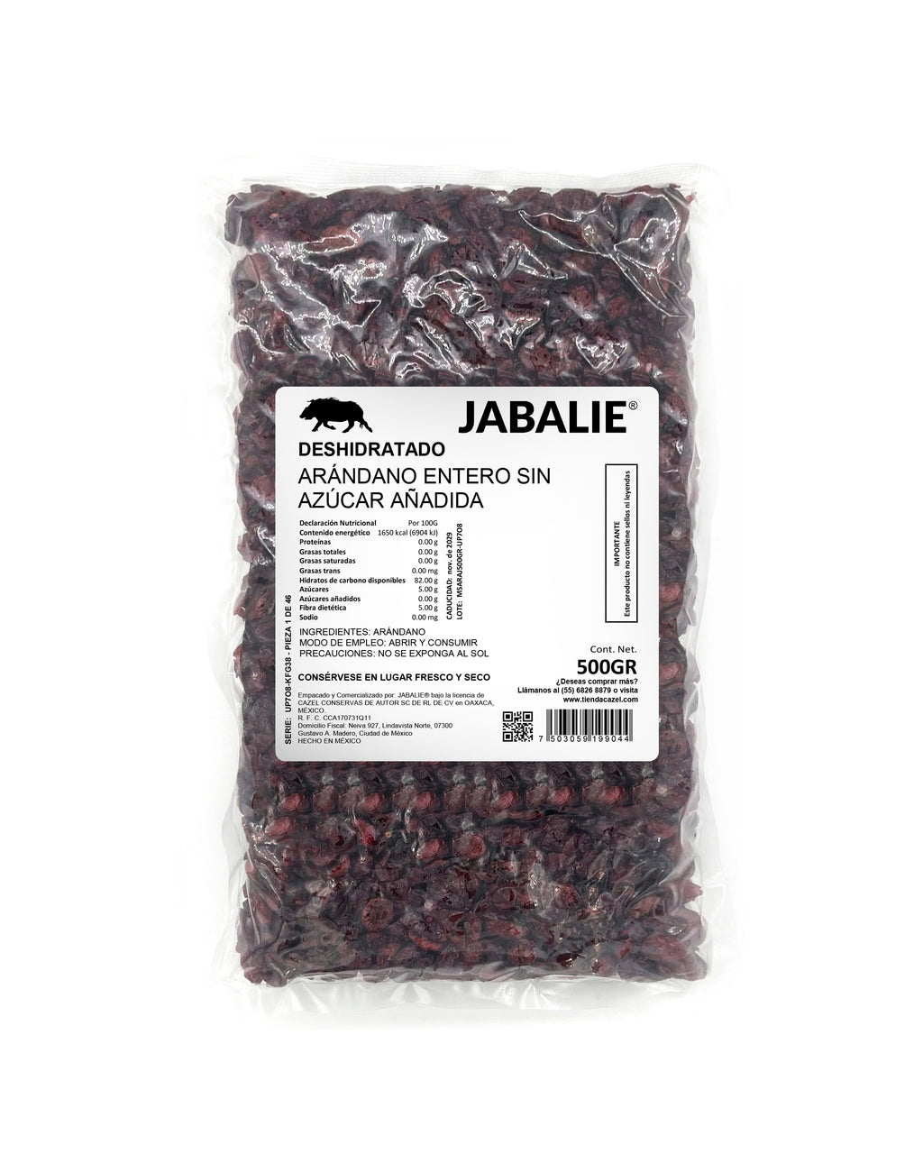 JABALIE® Deshidratado Arándano Entero Sin Azúcar Añadida 500 gr Arándanos deshidratados de calidad premium, seleccionados y procesados sin adición de azúcares refinados. Cada baya conserva su integridad física y su perfil nutricional completo, incluyendo antioxidantes naturales y fibra dietética. Ideales para incorporar en desayunos, mezclas de frutos secos, repostería artesanal o consumo directo. Presentación de 500 gramos en formato conveniente para uso doméstico o profesional. Producto sin aditivos, colorantes ni conservantes sintéticos, manteniendo el sabor concentrado y la textura característica del fruto deshidratado.