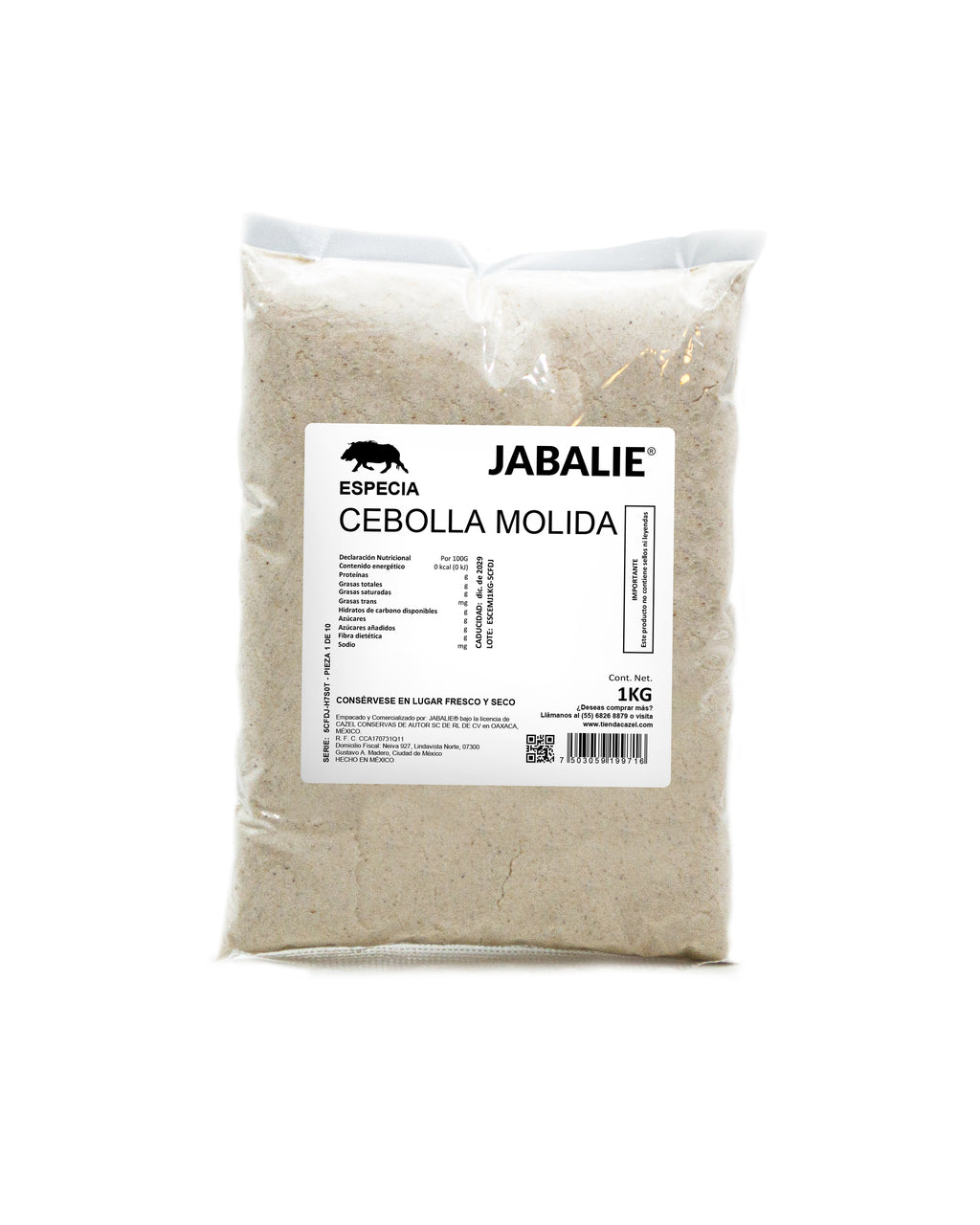 # JABALIE® Especia Cebolla Molida 1 kg Cebolla molida de primera calidad, ideal para potenciar el sabor de tus preparaciones culinarias. Este polvo fino se obtiene del deshidratado y molienda de cebolla premium, conservando su aroma y perfil aromático natural. Perfecto para marinadas, adobos, condimentos secos y bases de salsas. Su presentación en formato de 1 kg garantiza rendimiento prolongado en cocina profesional y doméstica. Sin aditivos ni conservantes, solo cebolla pura. Eleva el nivel de tus platillos con esta especia versátil y de sabor concentrado.