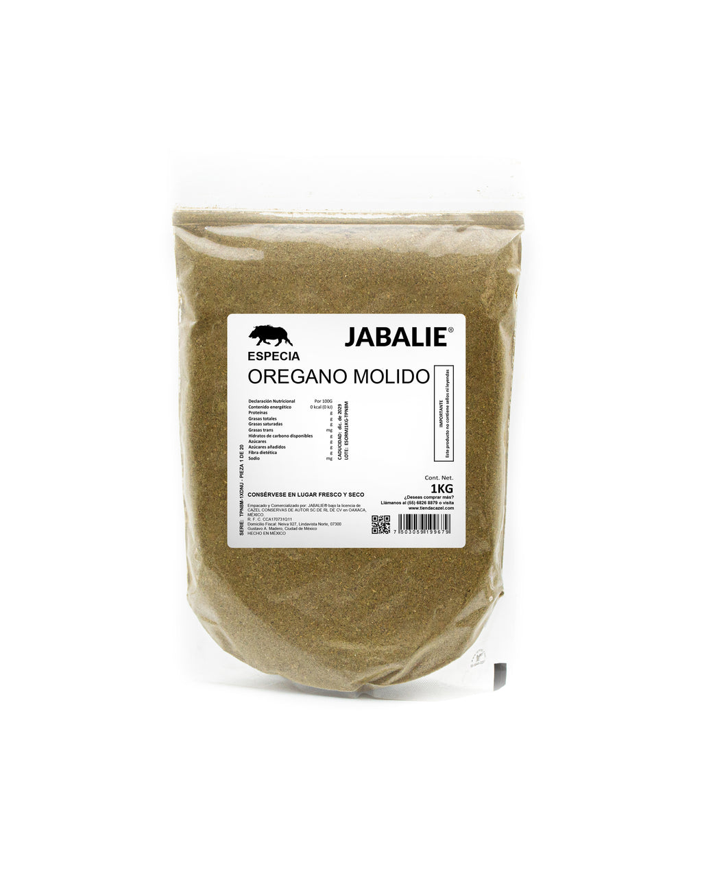 # JABALIE® Especia Oregano Molido 1 kg Oregano molido de calidad premium, cuidadosamente seleccionado y procesado para preservar su aroma y sabor intenso. Ideal para condimentar carnes, pescados, pastas, salsas y platillos mediterráneos. Presentación de 1 kg en formato económico, perfecto para cocinas profesionales y usuarios frecuentes. Sin aditivos ni conservantes, solo oregano puro que eleva el perfil de sabor de tus preparaciones culinarias.